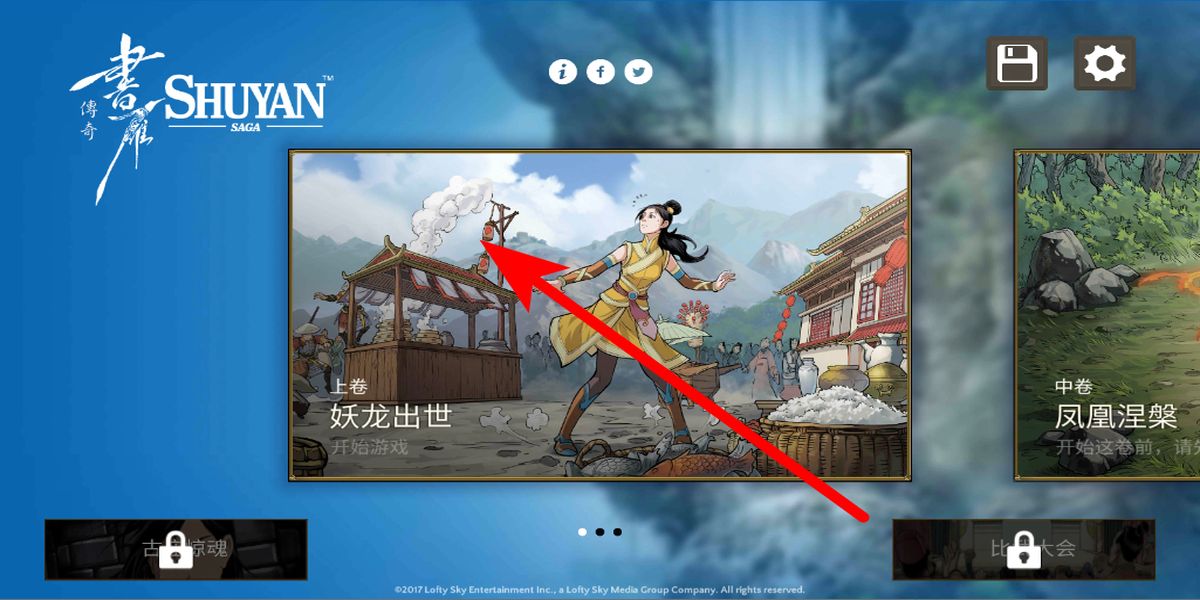 1、首先游戲要選擇關卡,在關卡選擇界面,能看到不同的章節(jié),如上卷妖龍出世等,點擊對應的章節(jié),即可進入該關卡,開啟相應的冒險劇情。