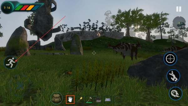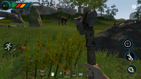 2、利用屏幕左下方虛擬搖桿控制角色移動(dòng),右側(cè)有奔跑、攻擊等按鈕,發(fā)現(xiàn)資源時(shí),點(diǎn)擊相應(yīng)按鈕收集,如點(diǎn)擊按鈕采集植物。