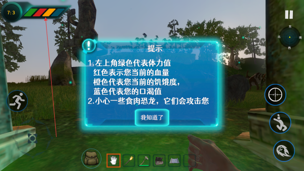 1、進(jìn)入留意左上角提示,綠色條代表角色體力值,橙色是饑餓度,藍(lán)色是口渴值,要維持?jǐn)?shù)值正常,避免角色狀態(tài)不佳,同時(shí),小心肉食恐龍攻擊。