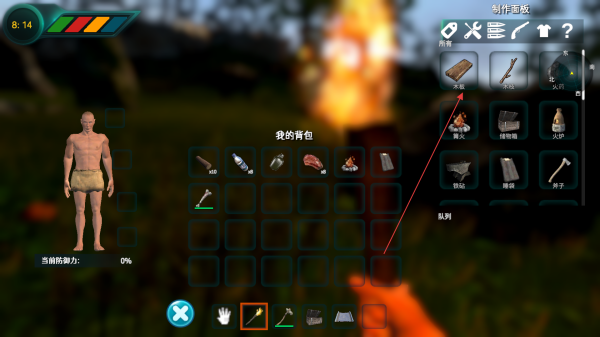 4、打開(kāi)我的背包界面,查看收集到的物品,點(diǎn)擊制作面板,消耗材料制作生存必需品,像木棍、火把等,保障生存需求。