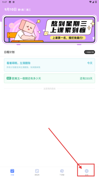 1、打開(kāi)日程或工具類應(yīng)用,點(diǎn)擊底部我的選項(xiàng),進(jìn)入個(gè)人設(shè)置頁(yè)面。