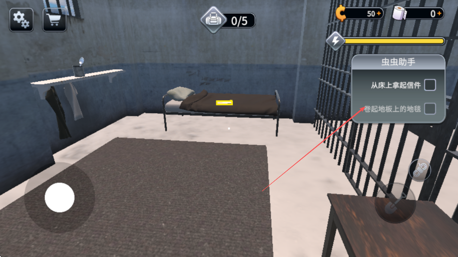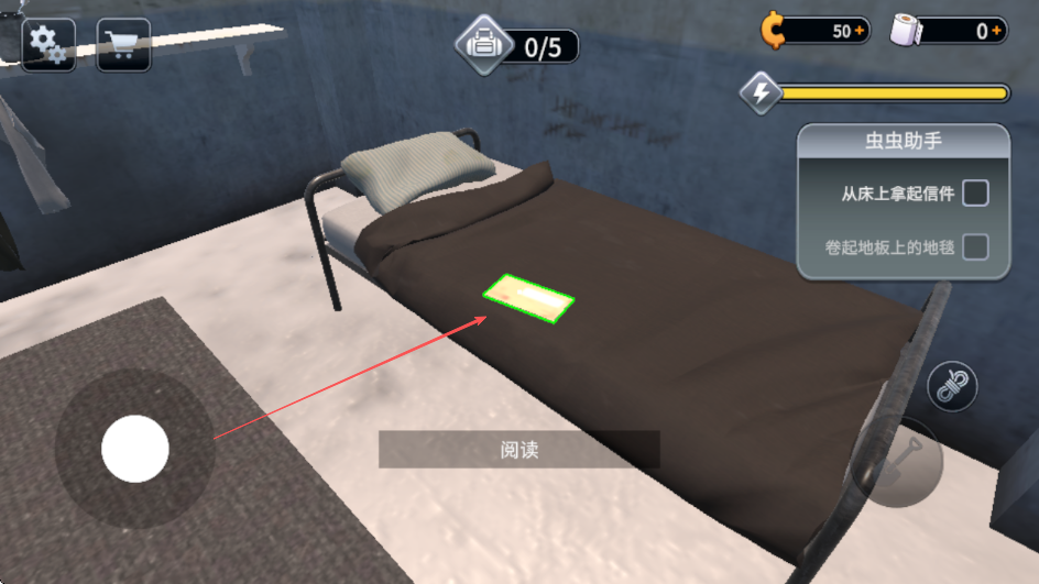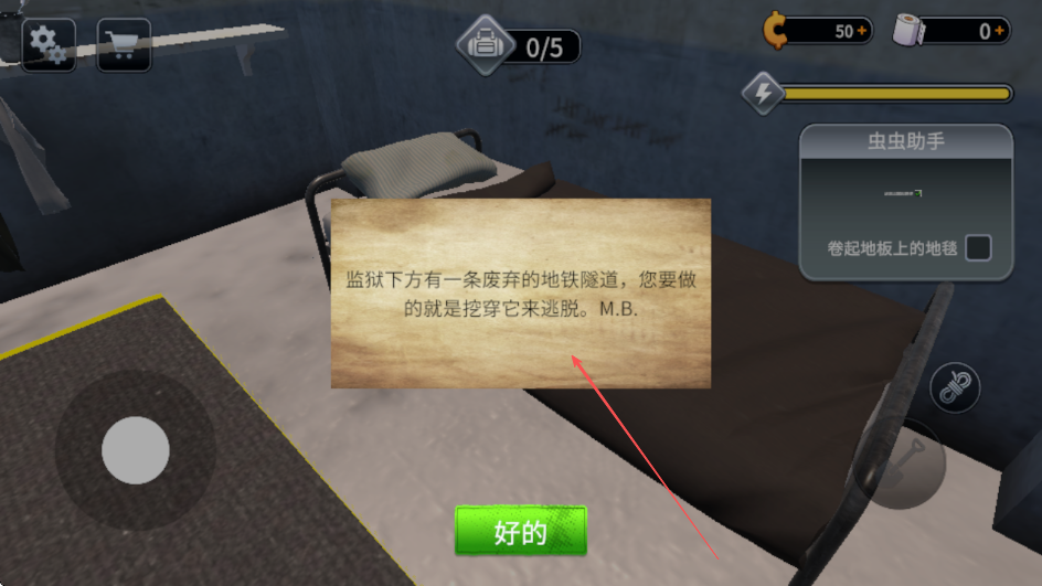 1、進入游戲界面觀察牢房環(huán)境,看到提示,知曉任務(wù)包括從床上拿起信件和卷起地板上的地毯。