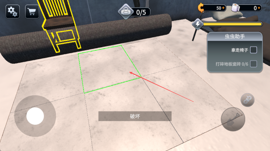 4、地毯卷起后,依據(jù)新提示拿走椅子打碎地板瓷磚0/6,點擊互動拿走椅子,對地板瓷磚進行破壞。