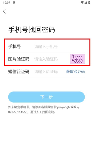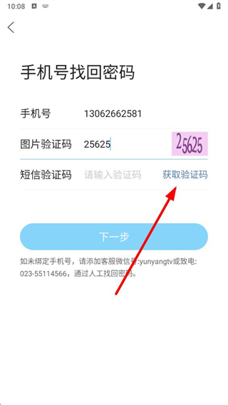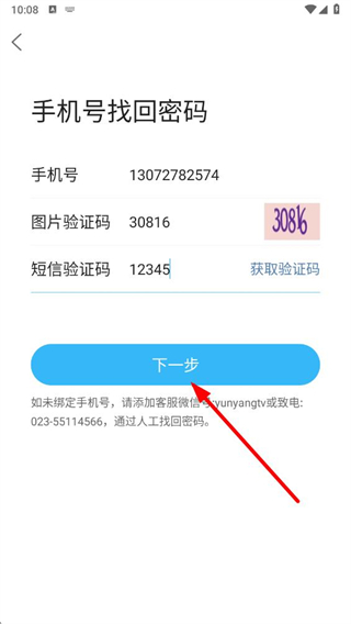 4、在手機(jī)號(hào)找回密碼頁(yè)面點(diǎn)擊下一步按鈕,按提示完成密碼找回操作即可。