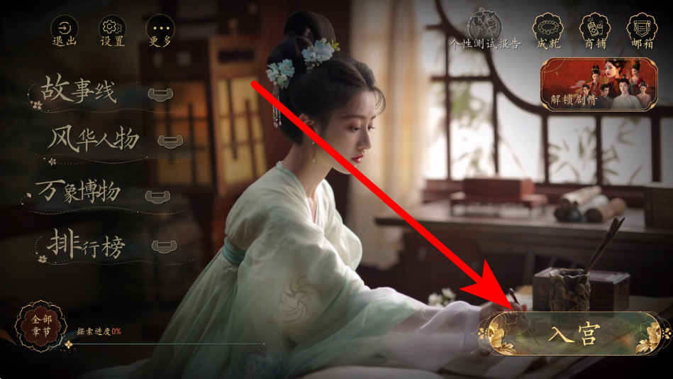 1、玩家首先開啟入宮,在游戲界面中,點(diǎn)擊入宮開始游戲按鈕,開啟宮廷探索的旅程,進(jìn)入到宮廷的初始場(chǎng)景。