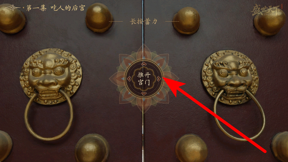 2、然后推開宮門,在面對(duì)宮門時(shí),按照提示長按蓄力,完成推開宮門的操作,進(jìn)入到宮門之后的宮廷區(qū)域。