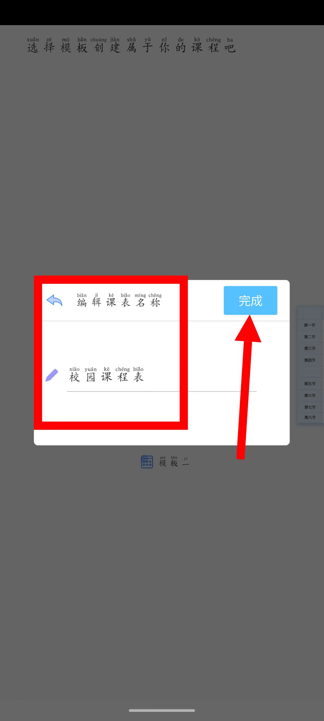 2、彈出編輯課表名稱彈窗后,確認(rèn)或修改課表名稱,點擊完成按鈕,完成課表創(chuàng)建。