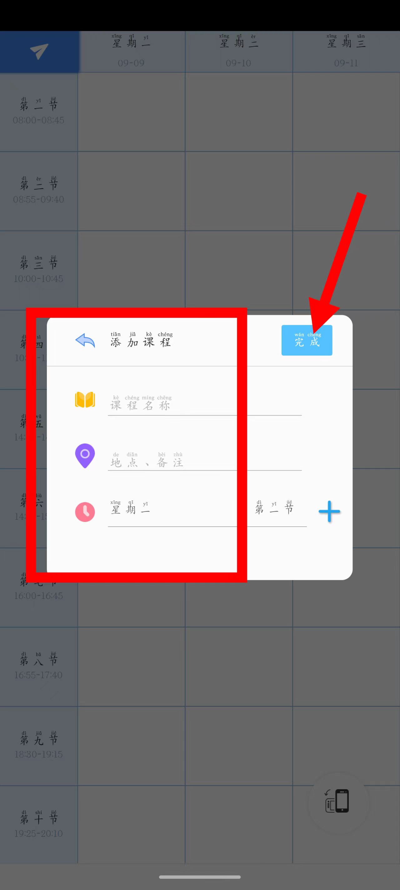 4、在彈窗添加課程,填寫完畢后點擊完成按鈕,即可將課程添加至課表。