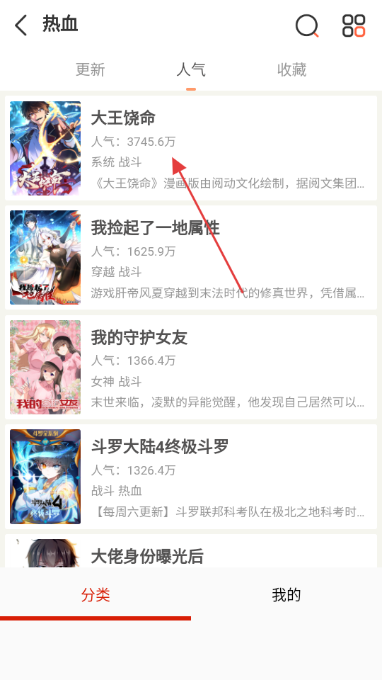 4、在熱血類內(nèi)容頁面,可選擇喜歡的作品,比如大王饒命點(diǎn)擊查看。