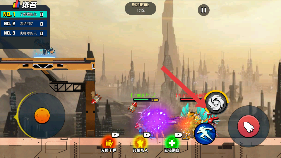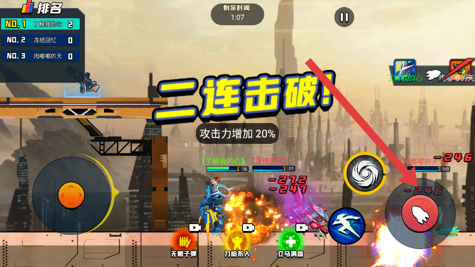 2、戰(zhàn)斗過程中留意每個按鍵的功能,可運用升級機(jī)甲的攻擊力、防御力等各項屬性,點擊釋放能量。