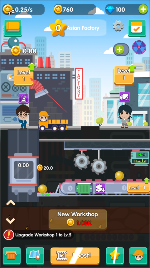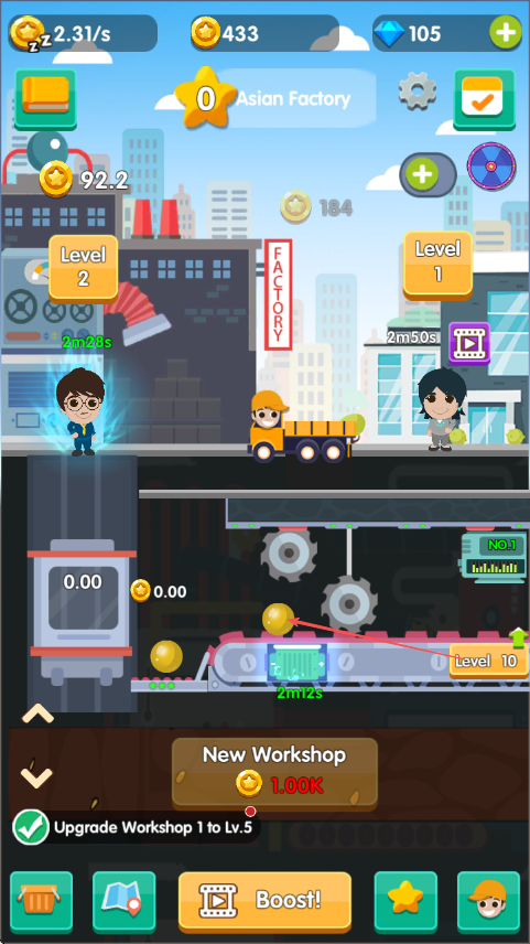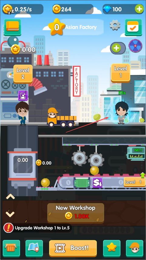 1、進入體育帝國大亨游戲界面,留意金幣鉆石數(shù)量,看到升級提示,優(yōu)先按要求升級車間。