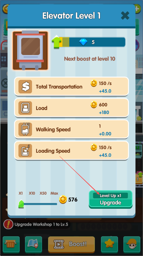 2、點擊電梯圖標(biāo),查看運輸、負載等數(shù)據(jù),花費資源點擊Upgrade升級電梯。