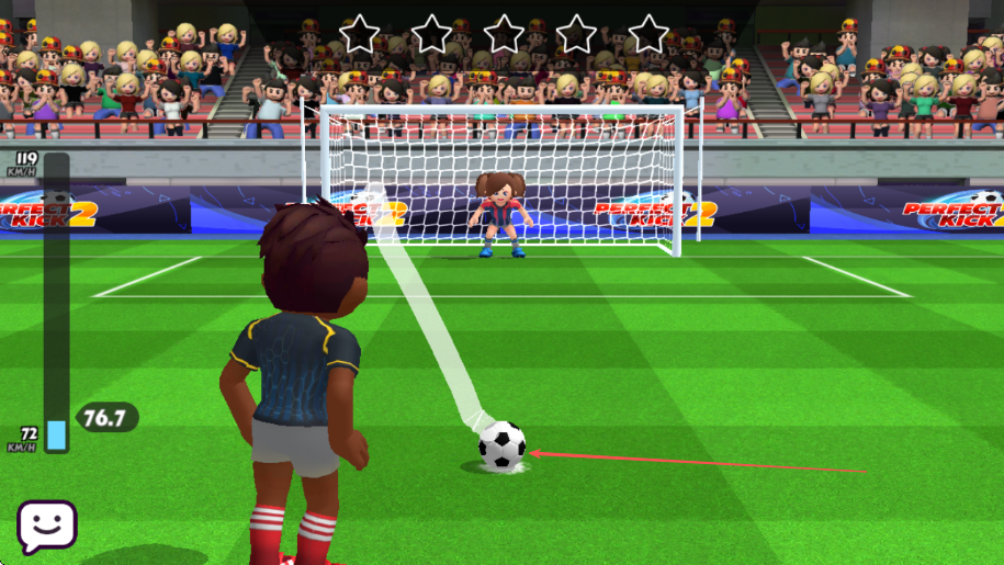 1、進(jìn)入游戲后,觀察足球與球門位置,通過滑動(dòng)屏幕調(diào)整射門方向和力度,力度條顯示在左側(cè)。