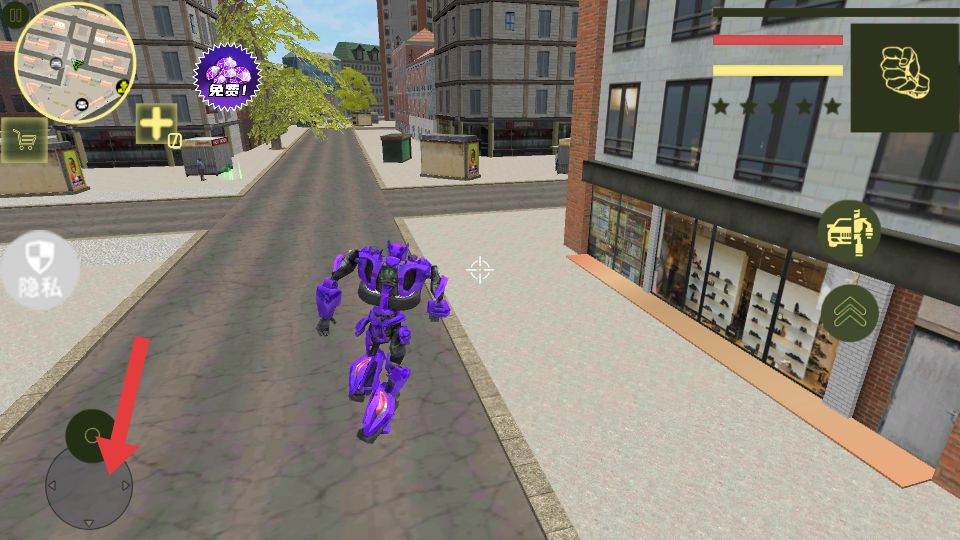 1、點(diǎn)擊左下角的方向操控按鈕,可控制紫色機(jī)器人在城市街道中移動(dòng),靈活調(diào)整行進(jìn)方向,探索不同區(qū)域。