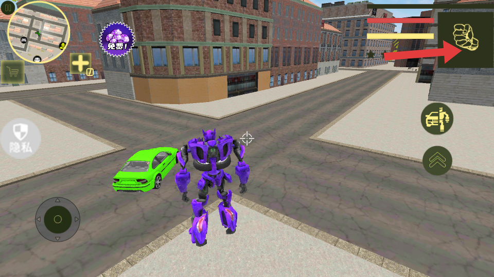 2、點(diǎn)擊右側(cè)的拳頭圖標(biāo),紫色機(jī)器人能對(duì)周?chē)矬w如綠色汽車(chē)發(fā)起攻擊,用于應(yīng)對(duì)敵人或破壞障礙物。