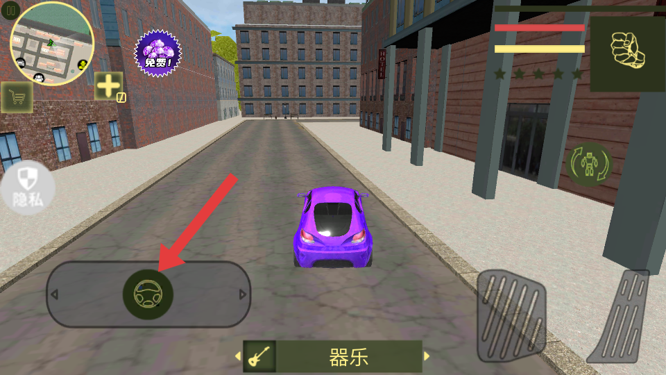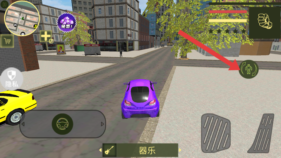 4、在汽車(chē)形態(tài)下,操作左側(cè)的方向盤(pán)按鈕,能控制紫色汽車(chē)的行駛方向,在城市道路中平穩(wěn)駕駛。