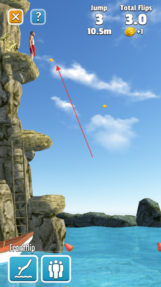 1、角色站懸崖邊,點(diǎn)擊Frontflip按鈕,朝著金幣方向起跳。