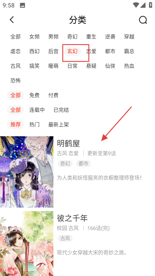 2、在分類(lèi)頁(yè)面,點(diǎn)擊玄幻分類(lèi),找到漫畫(huà)明鶴屋并點(diǎn)擊。