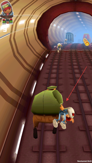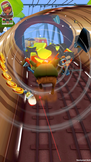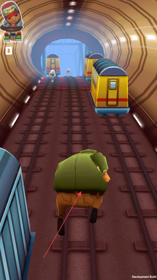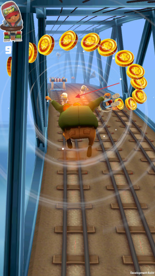 1、游戲開始,操控角色在鐵軌上奔跑,滑動(dòng)屏幕躲避前方的火車和障礙物。
