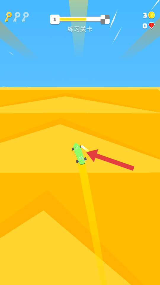 1、在練習(xí)關(guān)卡中,操控箭頭指向的滑板,沿著黃色路徑滑行,熟悉滑板的移動(dòng)手感與游戲基本操作,為后續(xù)競(jìng)速做好準(zhǔn)備。