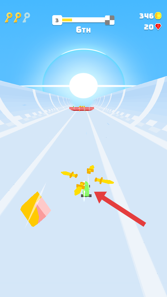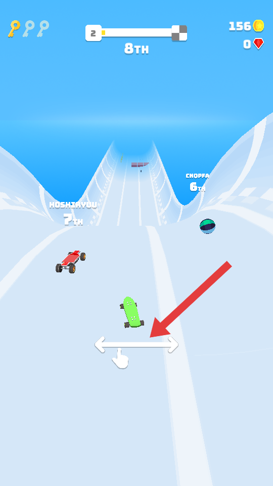 2、進(jìn)入多人競(jìng)速賽道后,通過(guò)箭頭指向的左右滑動(dòng)區(qū)域,靈活調(diào)整滑板的左右位置,躲避其他競(jìng)速單位,找準(zhǔn)時(shí)機(jī)超越對(duì)手。