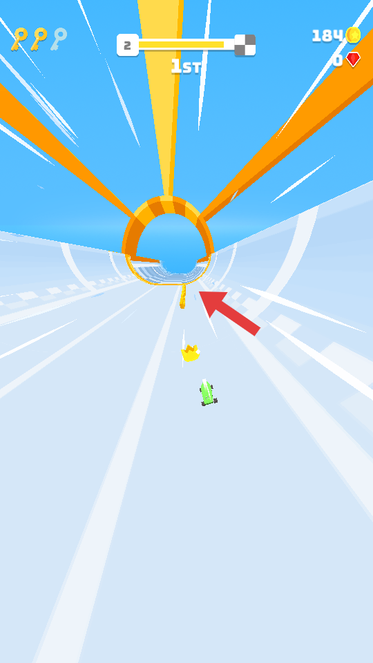 3、遇到賽道上的黃色圓環(huán)時(shí),操控滑板朝著箭頭指向的圓環(huán)方向滑行,穿過(guò)圓環(huán)可獲得加速或其他增益效果,提升競(jìng)速排名。