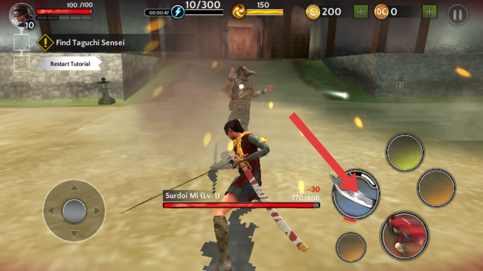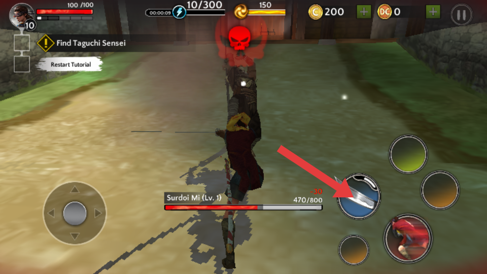 2、與敵人戰(zhàn)斗時,點擊箭頭指向的普通攻擊按鈕,使用武器對敵人發(fā)起了基礎(chǔ)的攻擊,逐步的消耗敵人的生命值。