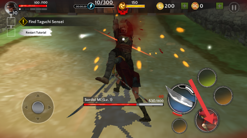 3、當敵人血量降低到一定程度或出現(xiàn)特定狀態(tài)時,點擊箭頭指向的技能按鈕,釋放強力技能,對敵人造成大量傷害。