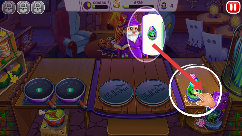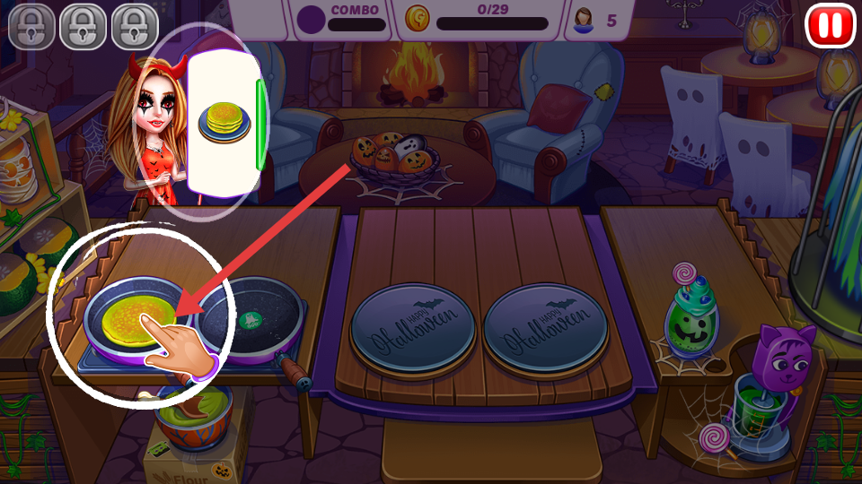 3、在制作食物過程中,關(guān)注箭頭指向的煎鍋,及時查看食物的烹飪狀態(tài),確保食物能在合適的時間完成烹飪。
