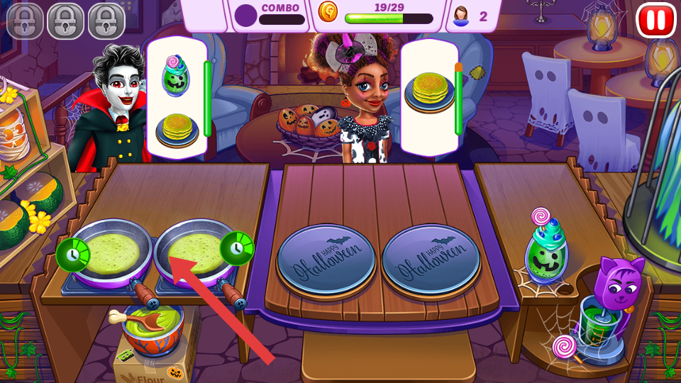 1、根據(jù)顧客需求,點(diǎn)擊箭頭指向的煎鍋,開始制作對應(yīng)食物,這是烹飪流程的第一步,為后續(xù)制作做好準(zhǔn)備。