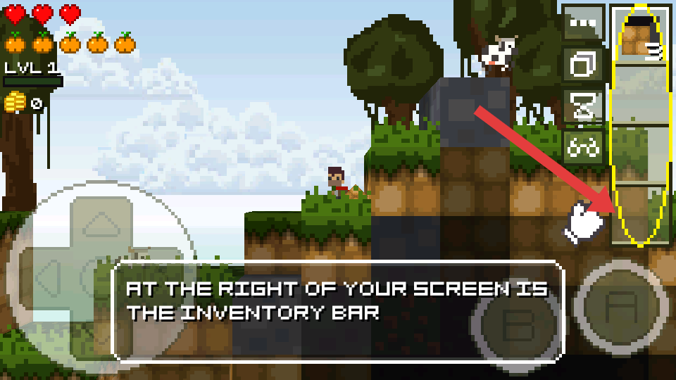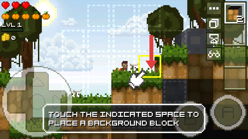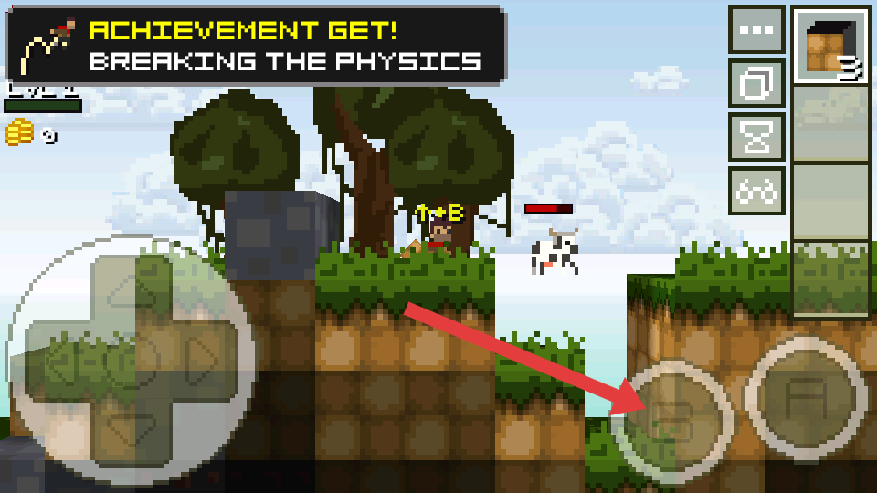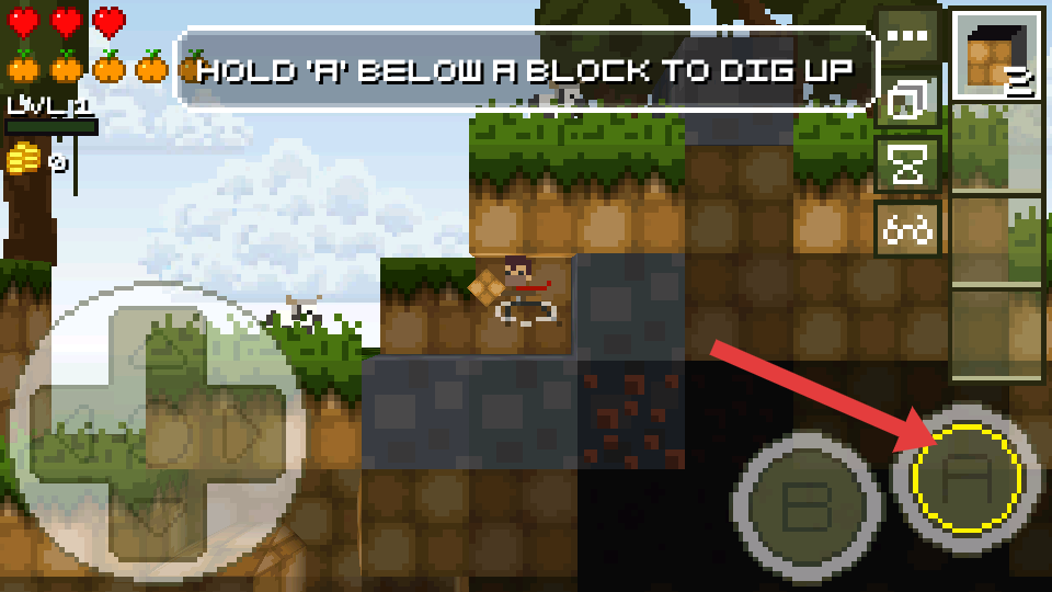 2、在方塊下方,按住箭頭指向的A按鍵,進行挖掘操作,可獲取方塊資源或開辟新的空間,用于收集材料等用途。