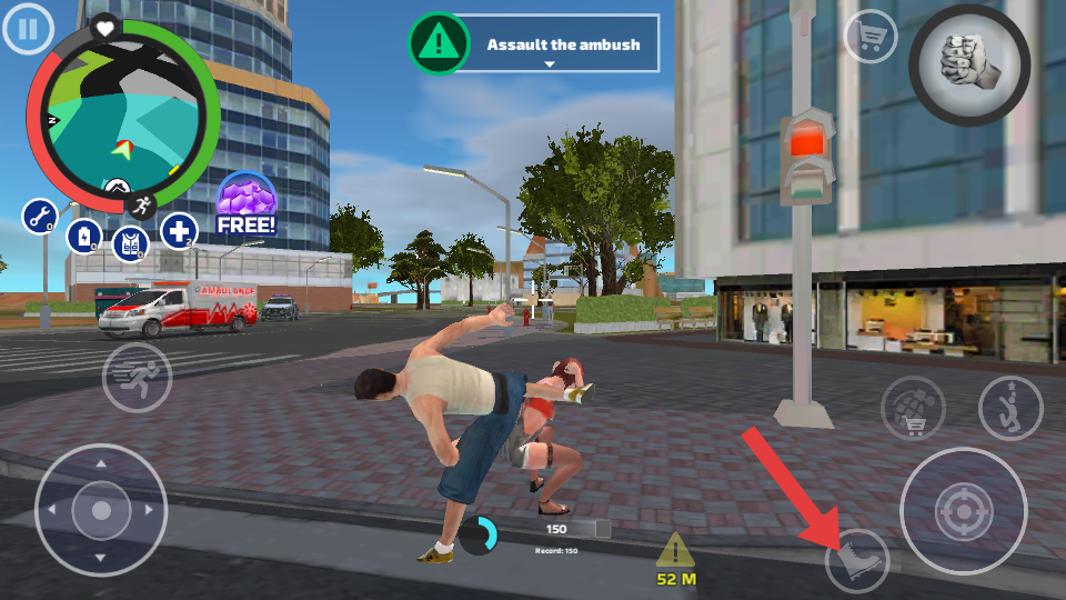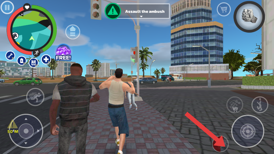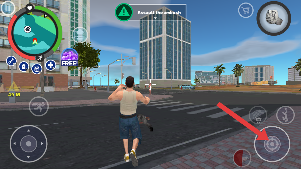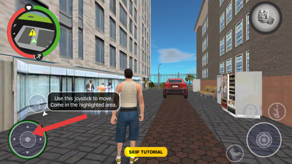 1、在城市場景中移動(dòng)時(shí),通過箭頭指向的虛擬搖桿,操控角色的移動(dòng)方向,前往目標(biāo)地點(diǎn),探索城市的不同區(qū)域。