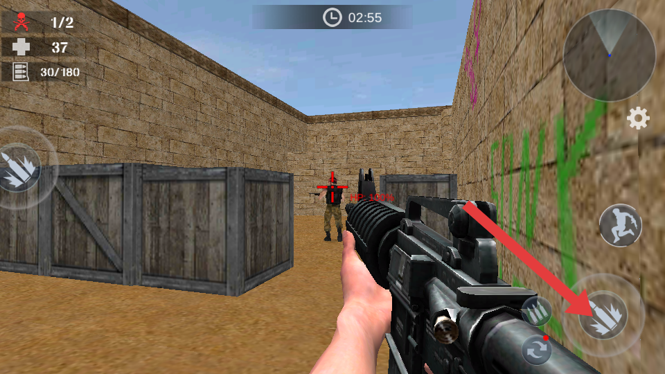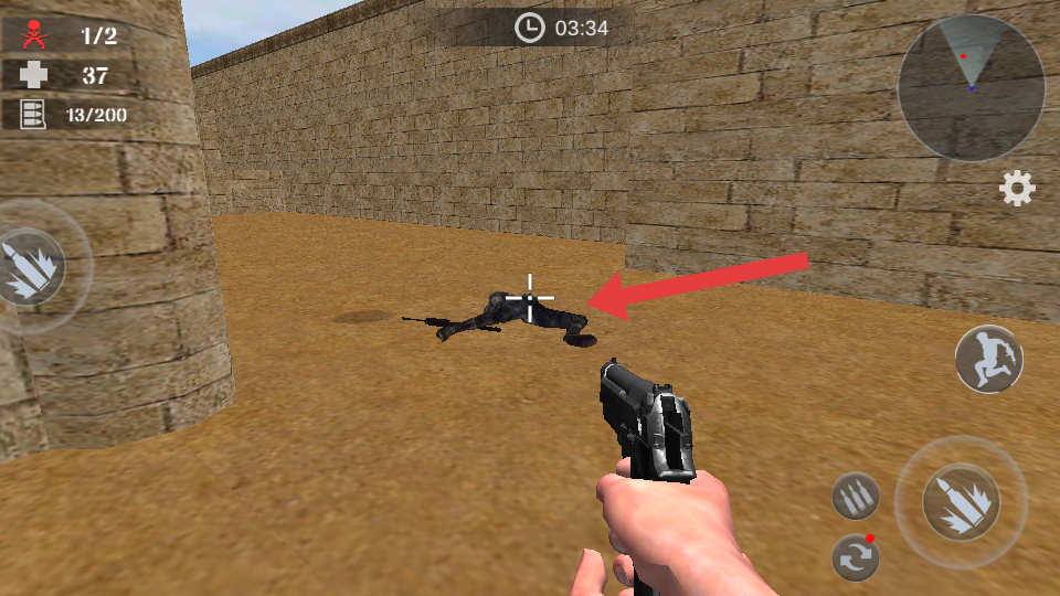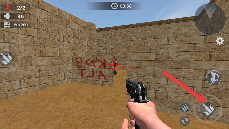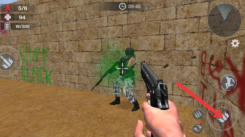 1、在場景中發(fā)現(xiàn)敵人時,點擊箭頭指向的射擊按鍵,向敵人開火,利用手槍火力對其造成傷害,嘗試擊殺敵人。