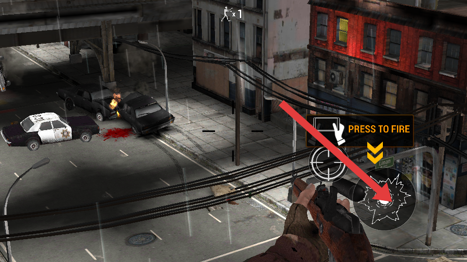 1、在城市街道場景中,瞄準(zhǔn)箭頭指向的目標(biāo)區(qū)域,點(diǎn)擊PRESS TO FIRE射擊按鍵,向目標(biāo)開火,對喪尸等敵人造成傷害。