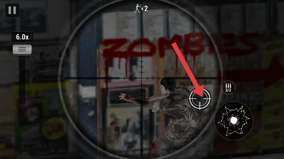 1、開局操作與瞄準(zhǔn):進(jìn)入游戲后點(diǎn)擊開始按鈕,戰(zhàn)斗時(shí)點(diǎn)擊瞄準(zhǔn),通過左側(cè)調(diào)節(jié)倍鏡倍數(shù)鎖定目標(biāo),射擊時(shí)需精準(zhǔn)瞄準(zhǔn)僵尸,避免誤殺幸存者。