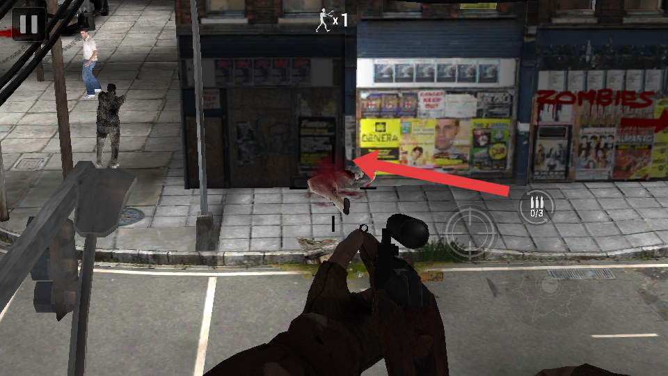 2、在參與者遇到靠近的喪尸的時(shí)候,瞄準(zhǔn)箭頭指向的快倒地的喪尸,快速射擊,阻止僵尸靠近,保障了自身的安全。