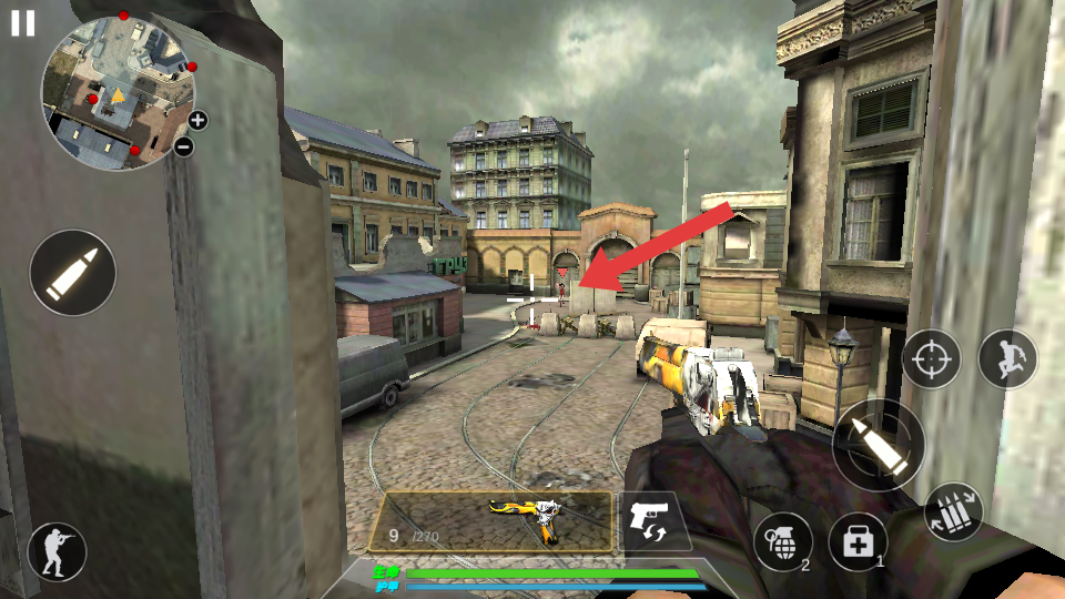 1、在城市街道場(chǎng)景中,瞄準(zhǔn)箭頭指向的遠(yuǎn)處目標(biāo)區(qū)域,準(zhǔn)備發(fā)起攻擊,利用武器火力對(duì)目標(biāo)造成傷害,推進(jìn)戰(zhàn)斗進(jìn)程。