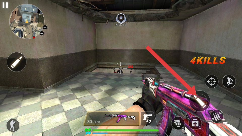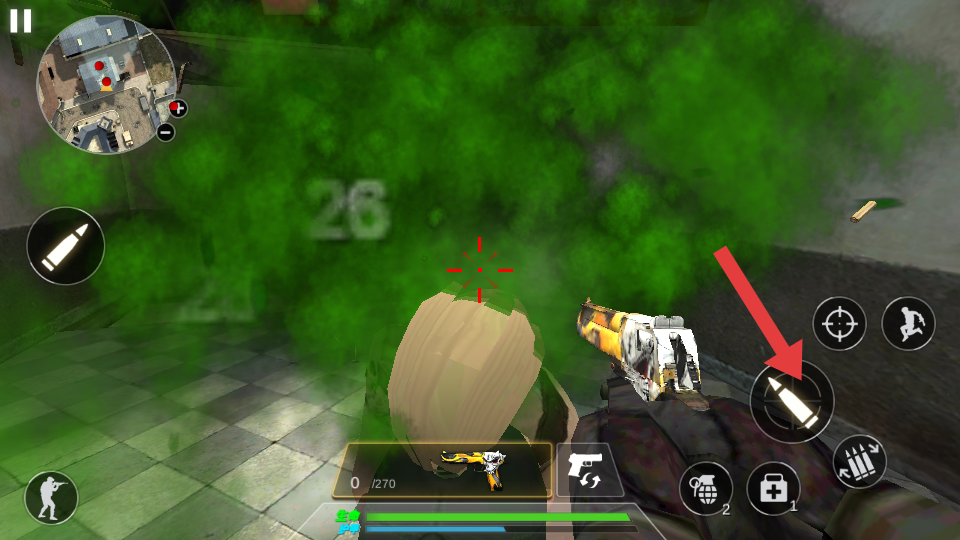 2、參與者遇到近距離敵人時(shí),點(diǎn)擊箭頭指向的武器攻擊按鍵,向敵人開(kāi)火,快速消滅敵人,保障自身的安全。
