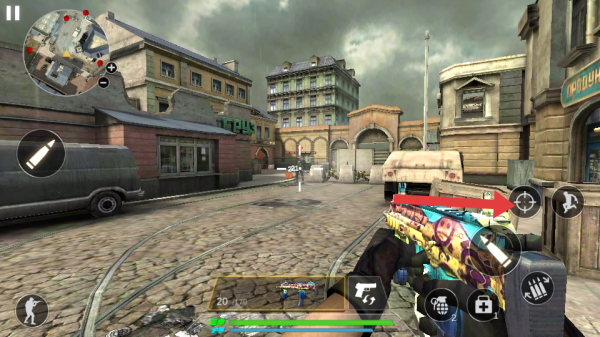 4、需要更精準(zhǔn)打擊遠(yuǎn)處目標(biāo)時(shí),點(diǎn)擊箭頭指向的瞄準(zhǔn)按鍵,開(kāi)啟瞄準(zhǔn)模式,精準(zhǔn)鎖定目標(biāo),發(fā)起有效攻擊。