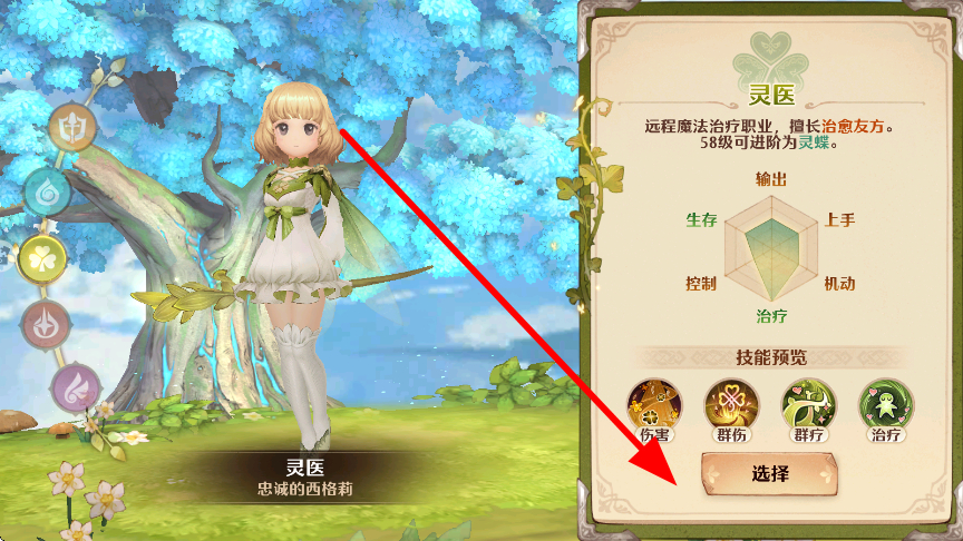 3、挑選選擇不同職業(yè),像靈醫(yī)這類遠程魔法治療職業(yè),擅長治愈友方,56級可進階,選擇好職業(yè)后,可運用相應(yīng)技能開展冒險。