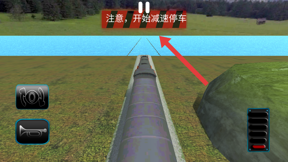2、當(dāng)屏幕出現(xiàn)注意,開始減速停車提示時,及時操作火車減速,平穩(wěn)???,避免因速度過快導(dǎo)致失誤。