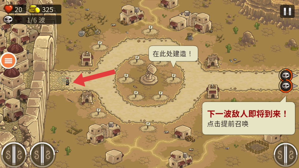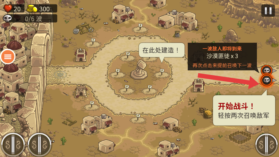 1、戰(zhàn)斗開始前,點擊右側(cè)骷髏圖標(biāo),輕按兩次召喚敵軍,開啟戰(zhàn)斗,面對沙漠匪徒等敵人做好防御準(zhǔn)備。
