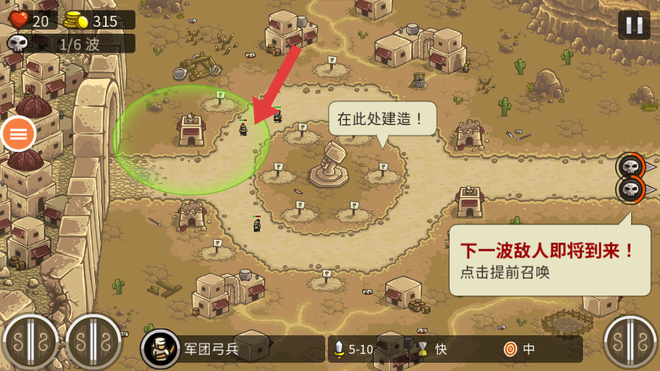 3、部署軍團(tuán)弓兵在綠色區(qū)域,借助其5-10的攻擊傷害和較快攻速,對進(jìn)入攻擊范圍的敵人進(jìn)行持續(xù)輸出。