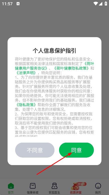 1、在個(gè)人信息保護(hù)指引彈窗中,點(diǎn)擊同意,進(jìn)入首頁。
