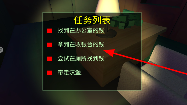 2、會(huì)出現(xiàn)任務(wù)列表,里面有諸如找到辦公室的錢、拿到收銀臺(tái)的錢等任務(wù),按照任務(wù)要求,前往對(duì)應(yīng)的地點(diǎn)去完成任務(wù),獲取獎(jiǎng)勵(lì)或推進(jìn)劇情。