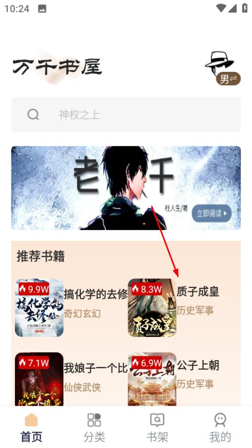 1、在萬(wàn)千書(shū)屋首頁(yè),點(diǎn)擊推薦書(shū)籍中的質(zhì)子成皇,進(jìn)入該書(shū)搜索結(jié)果頁(yè)。