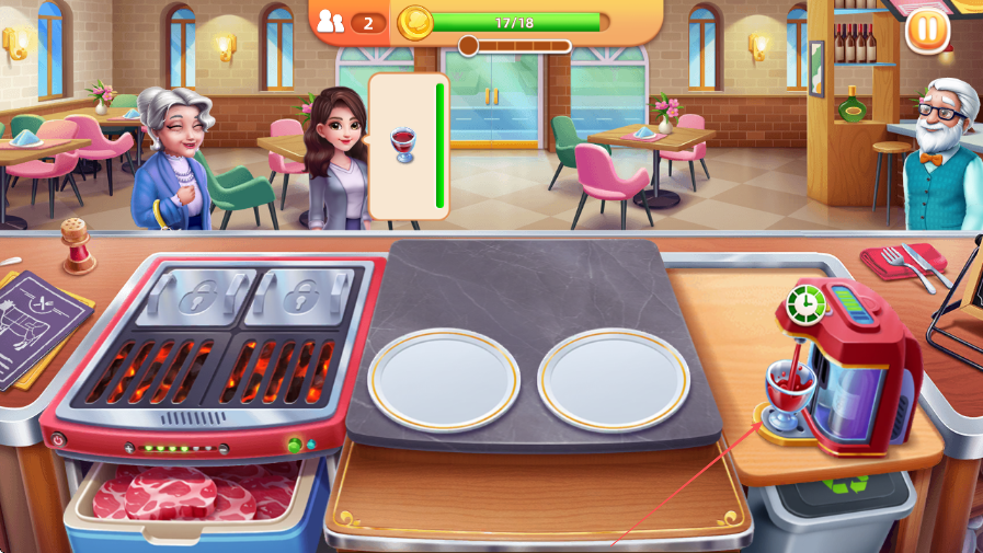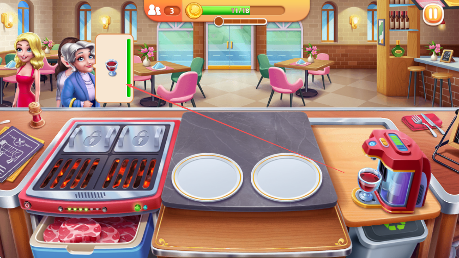 2、點(diǎn)擊右側(cè)機(jī)器制作紅酒并上菜,繼續(xù)滿(mǎn)足其他顧客需求。