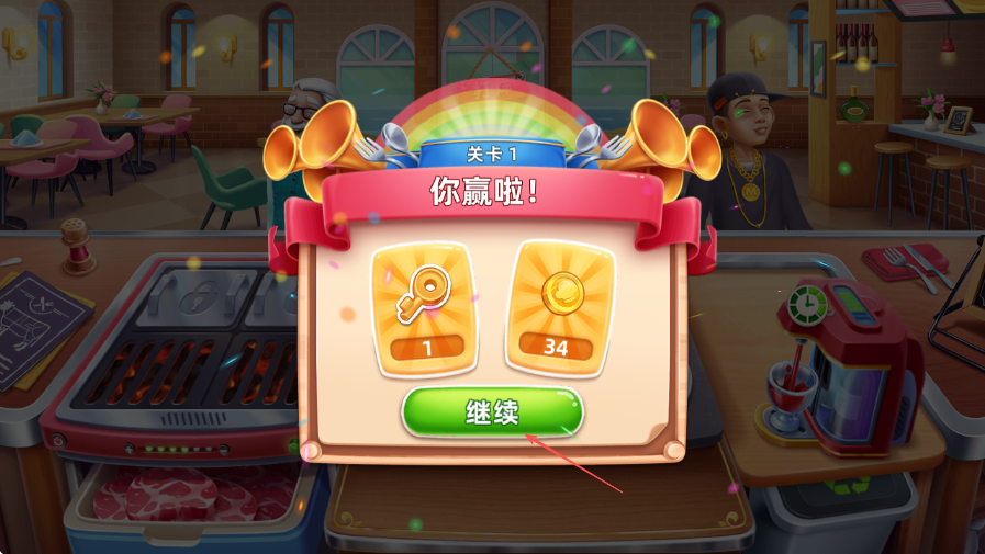4、完成關(guān)卡內(nèi)所有顧客訂單,出現(xiàn)你贏啦界面,點(diǎn)擊繼續(xù)進(jìn)入下一關(guān)。