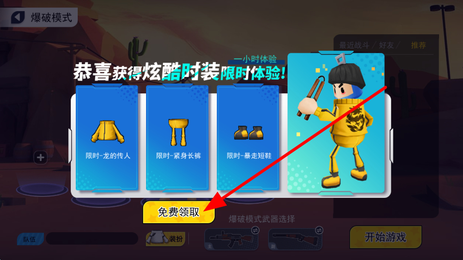 1、開局游戲界面中,遇到領取炫酷時裝的提示時,點擊免費領取,即可獲取限時體驗的時裝,為角色換上新裝扮,讓角色更具特色。