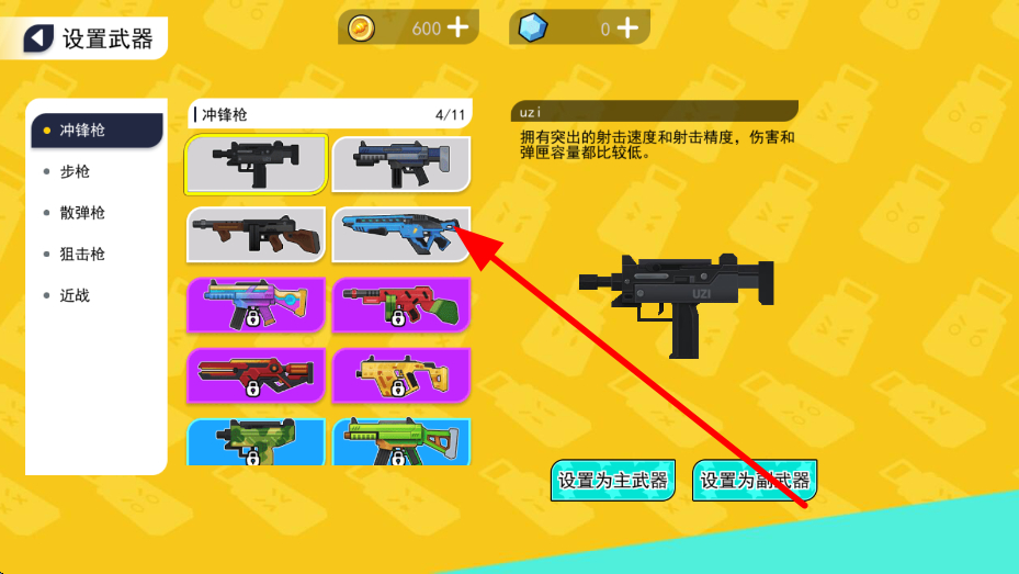 2、進入設置武器,有沖鋒槍、步槍等多種類型武器可供選擇,根據不同武器的射擊速度、傷害等屬性,挑選適合自己戰(zhàn)斗風格的武器。